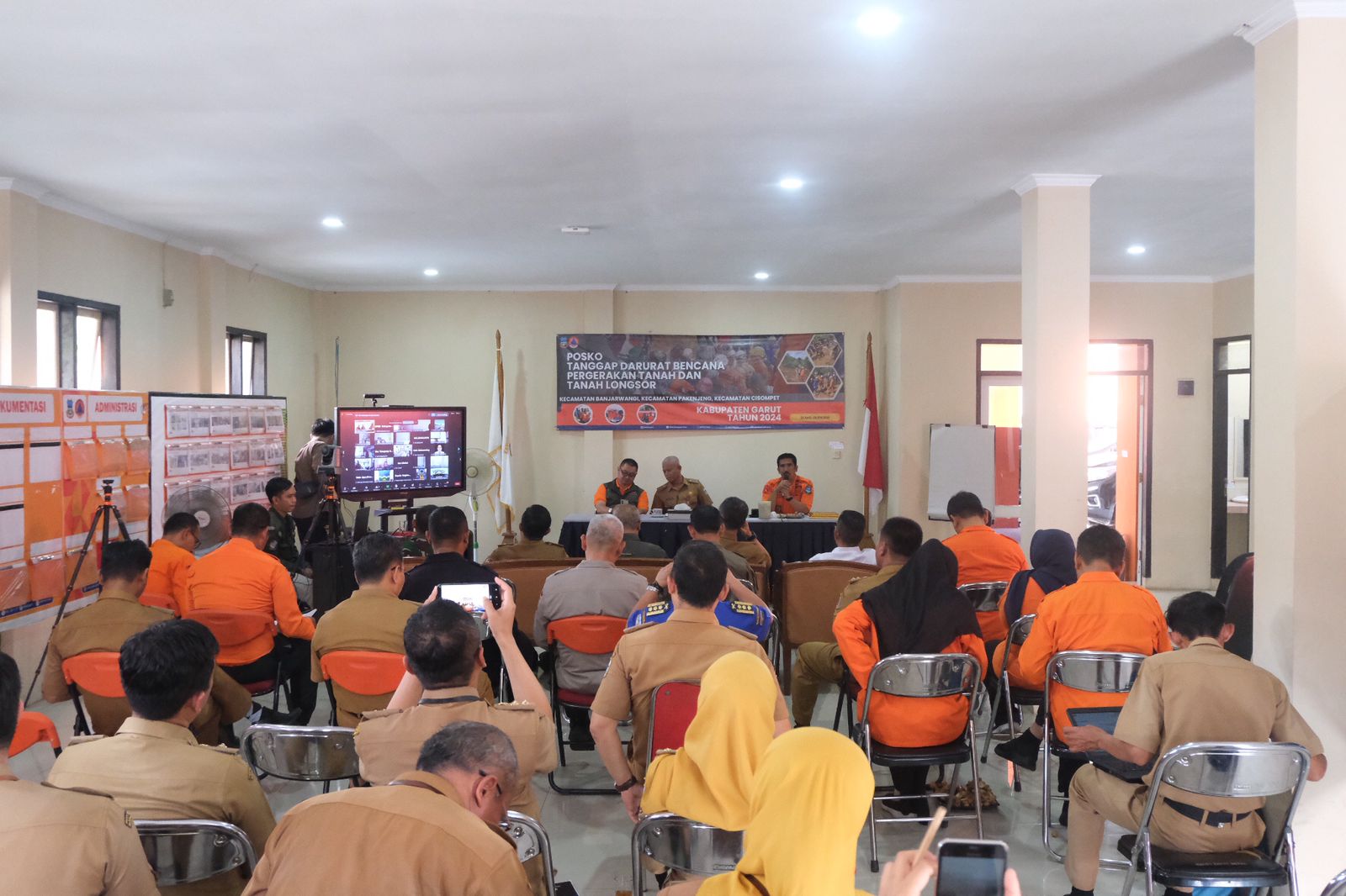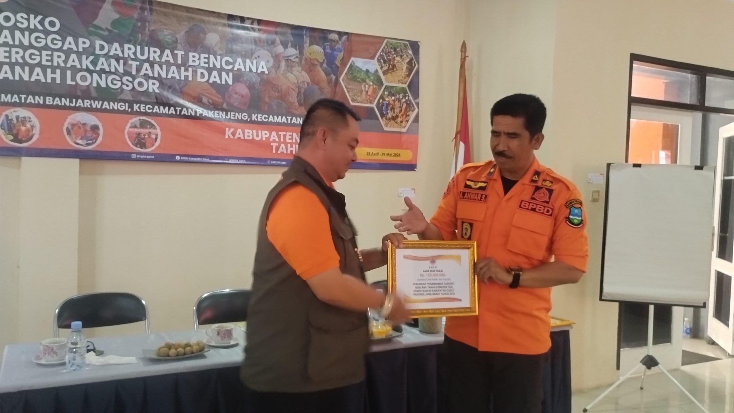 Dalam rakor ini, dilakukan penyerahan bantuan operasional berupa uang tunai sebesar Rp150 juta, serta bantuan dukungan logistik dan peralatan dari Badan Nasional Penanggulangan Bencana (BNPB), yakni tenda pengungsian 2 set, tenda keluarga 25 set, pompa portable 2 unit, light tower 1 unit, selimut 100 lembar, matras 100 lembar, hygene kit 50 paket, sembako 100 paket, makanan siap saji 100 pouch, hingga makanan dan perlengkapan bayi 100 paket, diterima secara simbolis oleh Kepala Pelaksana (Kalak) BPBD Kabupaten Garut, Aah Anwar Saefulloh.