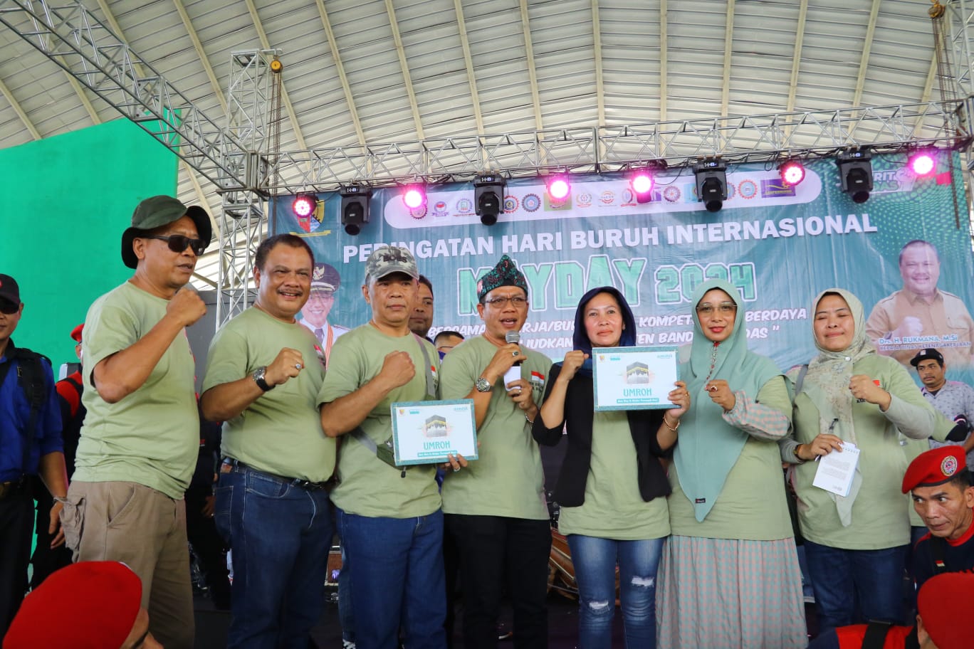 Sebelum meninggalkan lokasi Peringatan Hari Buruh Internasional May Day 2024, Kang DS memberikan hadiah door prize 2 tiket melaksanakan ibadah umrah ke Tanah Suci Mekkah Arab Saudi untuk buruh Kabupaten Badung yang hadir saat itu.