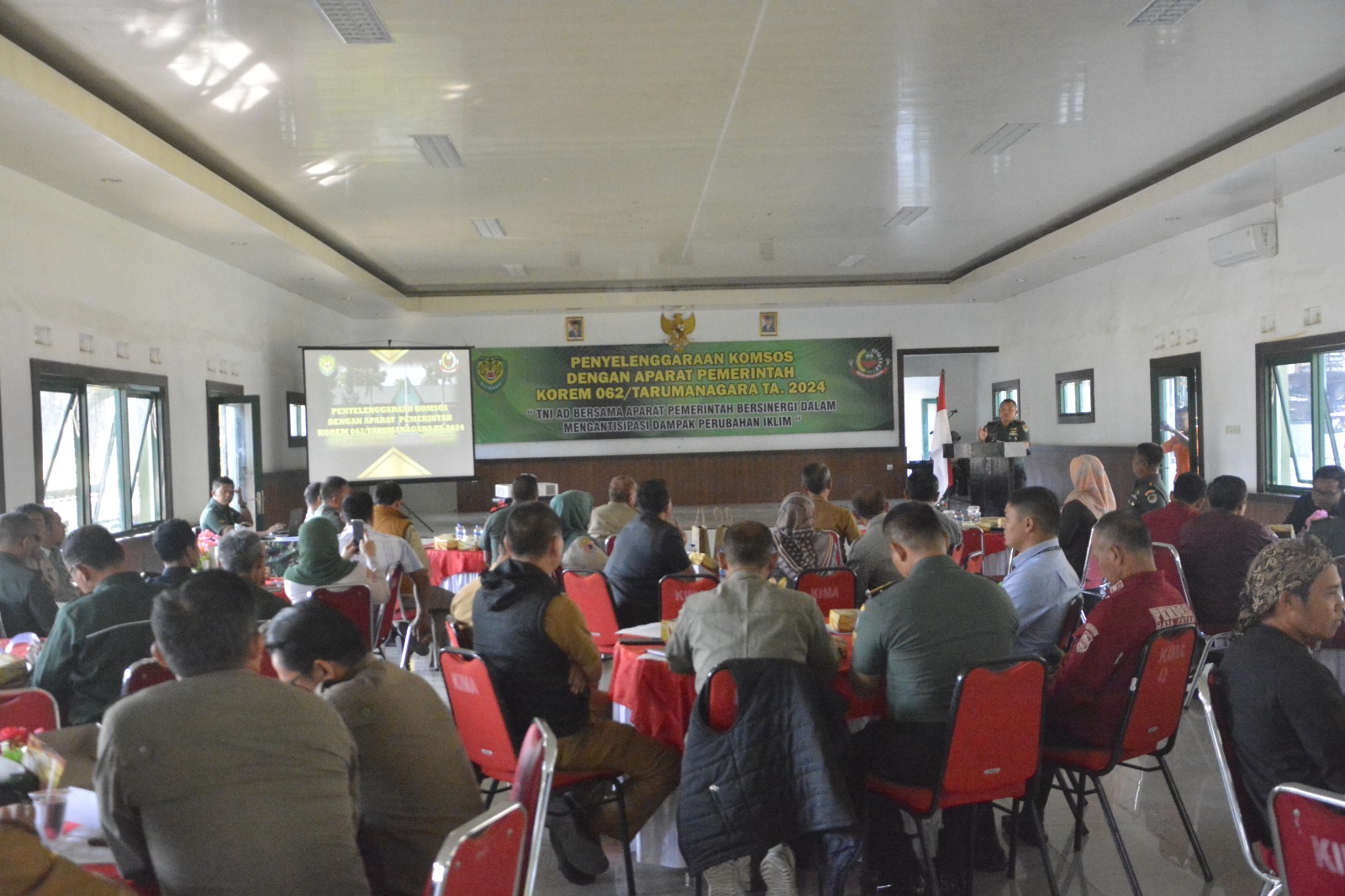 Dalam sambutannya Danrem 062/Tn Kol Arh Rudi Ragil. SP, S.Sos., M.Si., yang dibacakan Kasrem 062/Tn Letkol Inf Hamzah Budi Susanto, S.E., M.I.P., menyampaikan acara Komsos dengan Aparat Pemerintah ini merupakan salah satu metode Binter, dan juga merupakan program kerja dari Komando atas yang harus dilaksanakan oleh satuan dalam mendukung program pemerintah yang bertujuan, untuk memelihara dan meningkatkan hubungan antara Prajurit TNI AD dengan Aparat Pemerintah dalam pemahaman tentang dampak perubahan iklim akan berpengaruh besar terhadap segala macam aspek pemanasan global,bisa menghambat proses penghijauan dalam jangka panjang, marilah kita bersama-sama mempersiapkan diri dan menciptakan terobosan terobosan, sehingga kita mampu mengatasi tantangan dari perubahan iklim ini sesuai dengan peran dan tugas yang kita emban masing-masing.