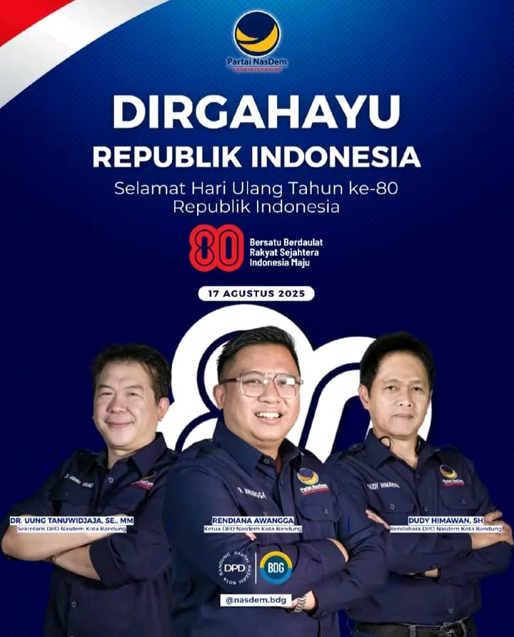 Bandung Minggu 17 Agustus 2025 Dalam rangka memperingati Hari Ulang Tahun ke-80 Republik Indonesia, Dewan Pimpinan Daerah (DPD) Partai NasDem Kota Bandung menyampaikan ucapan selamat dan doa bagi bangsa Indonesia agar semakin maju dan sejahtera.