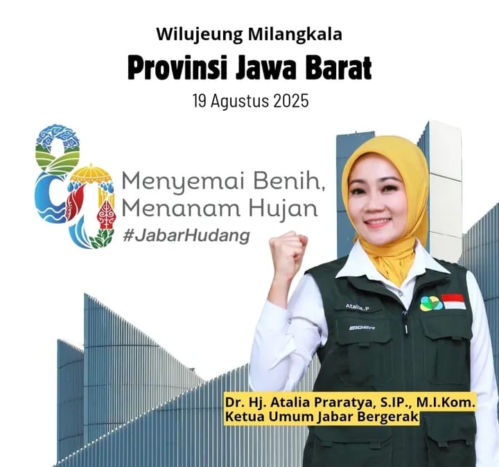 Ketua Umum Jabar Bergerak, Dr. Hj. Atalia Praratya, S.IP., M.I.Kom., menyampaikan bahwa momen milangkala Jawa Barat menjadi pengingat bagi seluruh masyarakat untuk terus menjaga alam, memperkuat persatuan, dan menanam kebaikan bagi generasi mendatang.