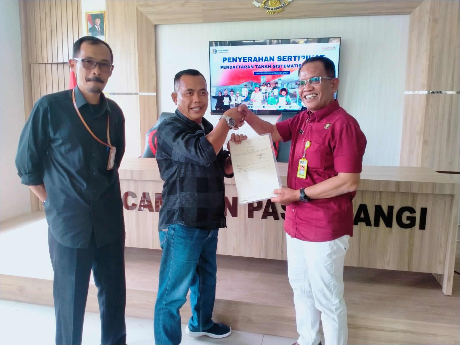 Penyerahan sertifikat dilakukan secara simbolis pada hari ini di Aula Kecamatan Pasirwangi, Desa Sirnajaya. Kegiatan tersebut dihadiri oleh Kepala Seksi Penetapan Hak dan Pendaftaran BPN Kabupaten Garut, Fransiscus Muljoto, S.SiT, yang mewakili Kepala BPN Garut.