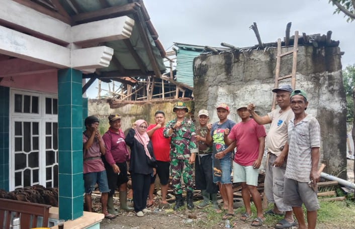 GARUT —Sejumlah warga Kampung Jatisari RT 02 RW 07, Desa Mekarsari, Kecamatan Cibalong, bergotong royong bersama Babinsa Desa Mekarsari untuk menurunkan atap rumah milik Ibu Titin yang roboh akibat hujan deras pada Minggu, 16 November 2025.