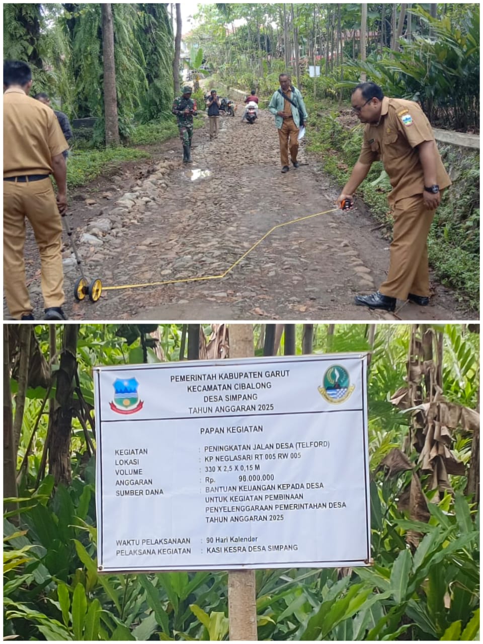 Pekerjaan tersebut memiliki volume sepanjang 330 meter, lebar 2,5 meter, dan ketebalan 0,15 meter, dengan total anggaran sebesar Rp98 juta. Pembangunan difokuskan pada pemadatan dan perkerasan jalan desa sebagai tahap awal peningkatan akses transportasi warga.